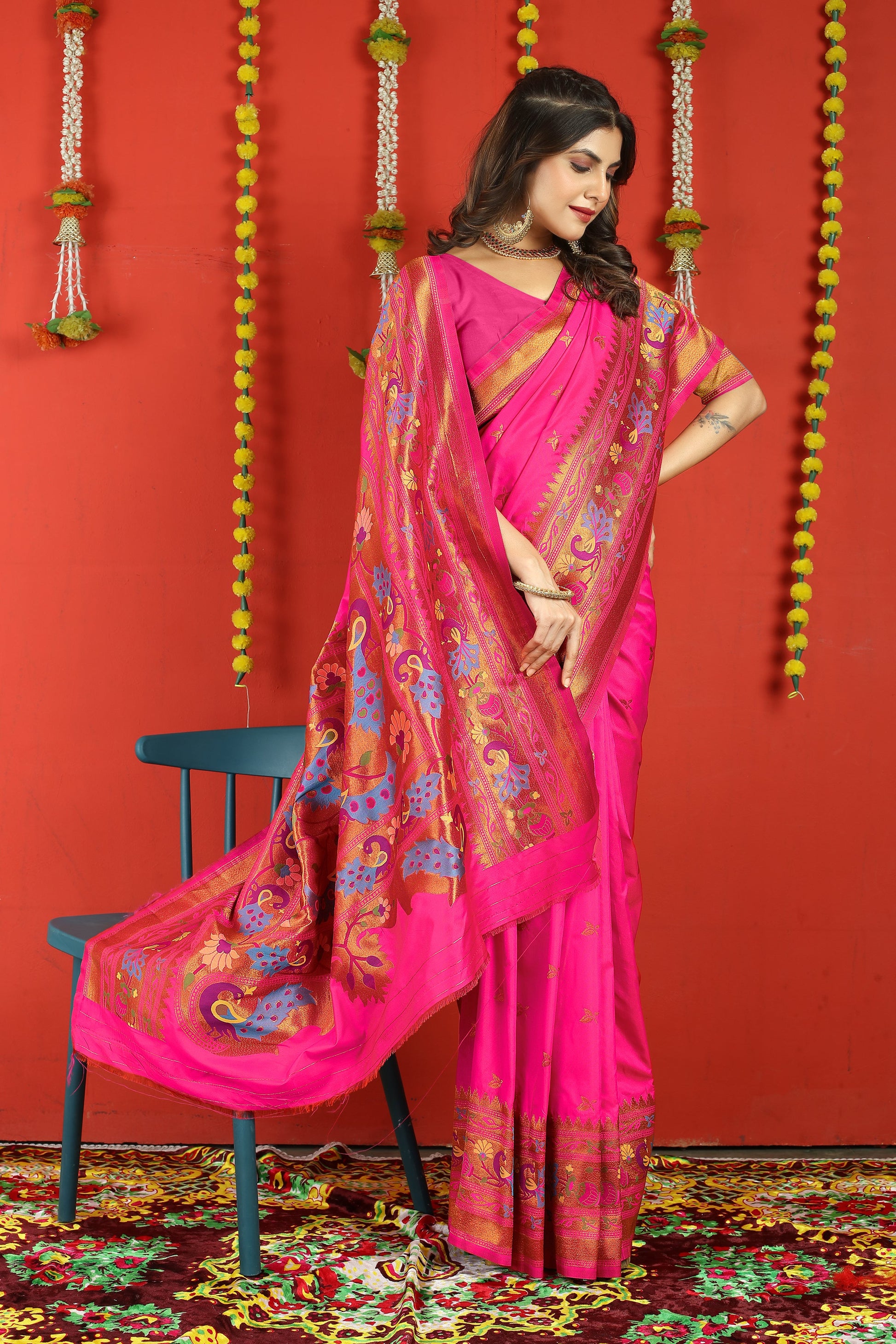 Dhiyona GR Women's Fancy Mor Hot Pink Zari Paithani Silk Saree