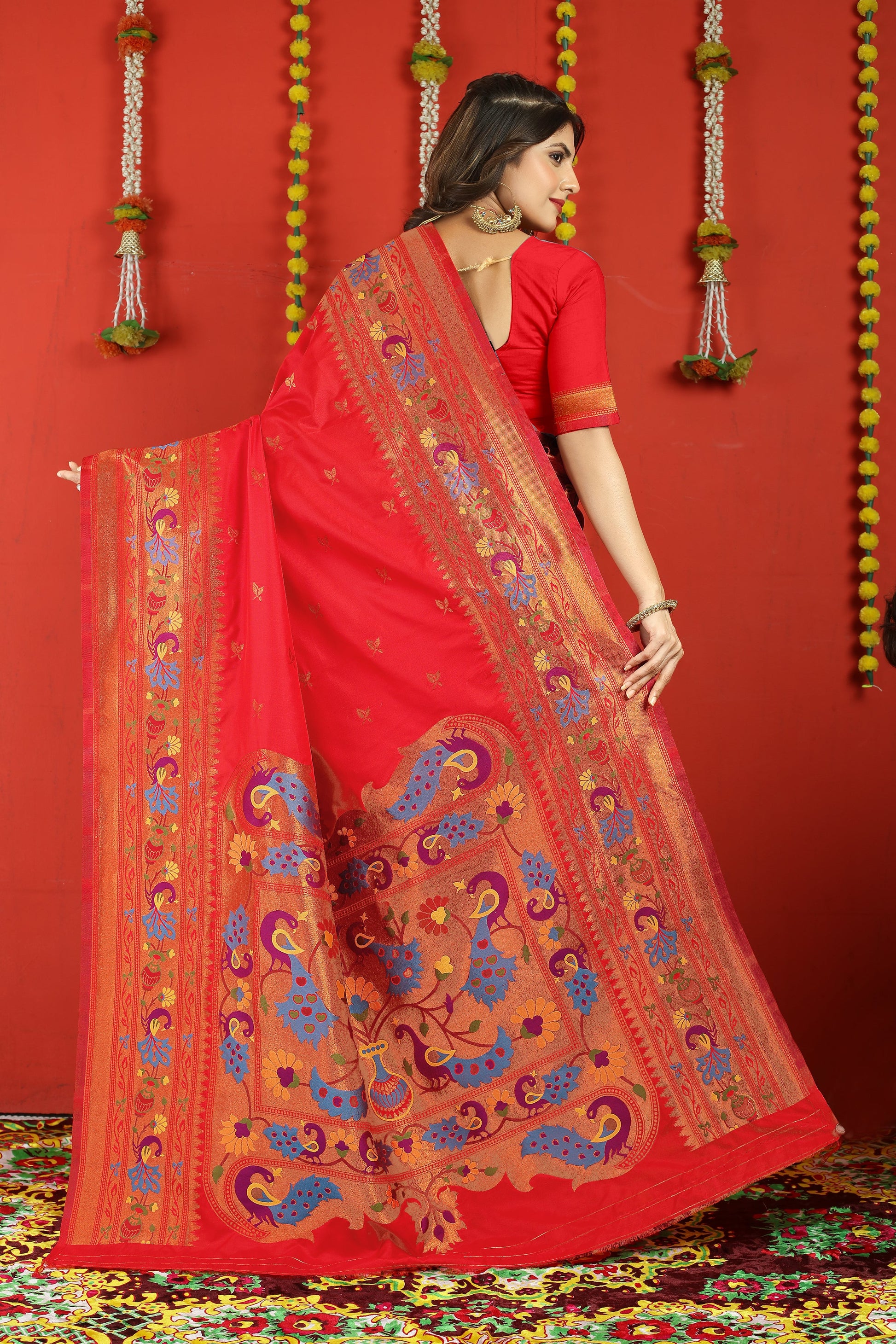 Dhiyona GR Women's Fancy Mor Red Zari Paithani Silk Saree