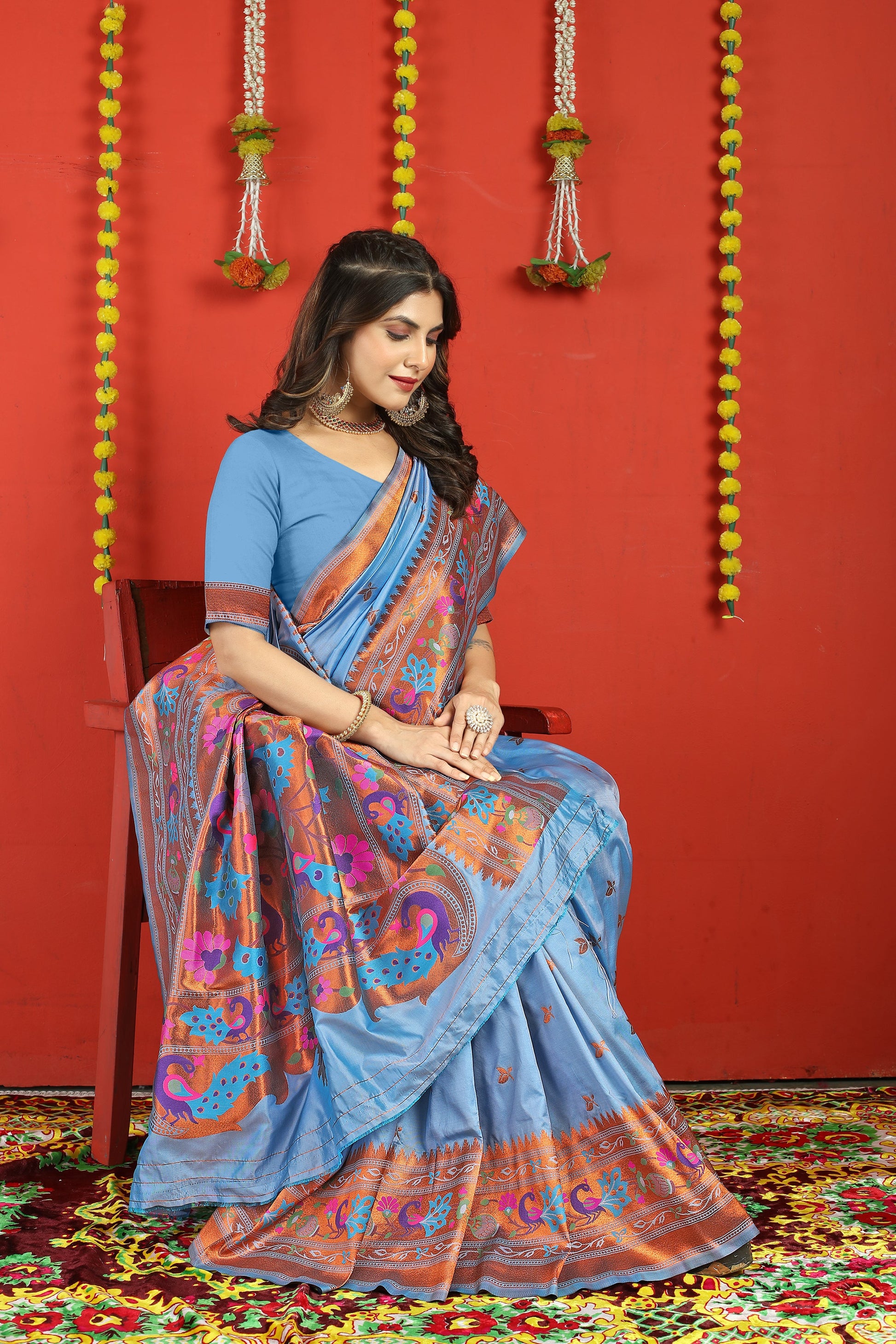 Dhiyona GR Women's Fancy Mor Sky Blue Zari Paithani Silk Saree