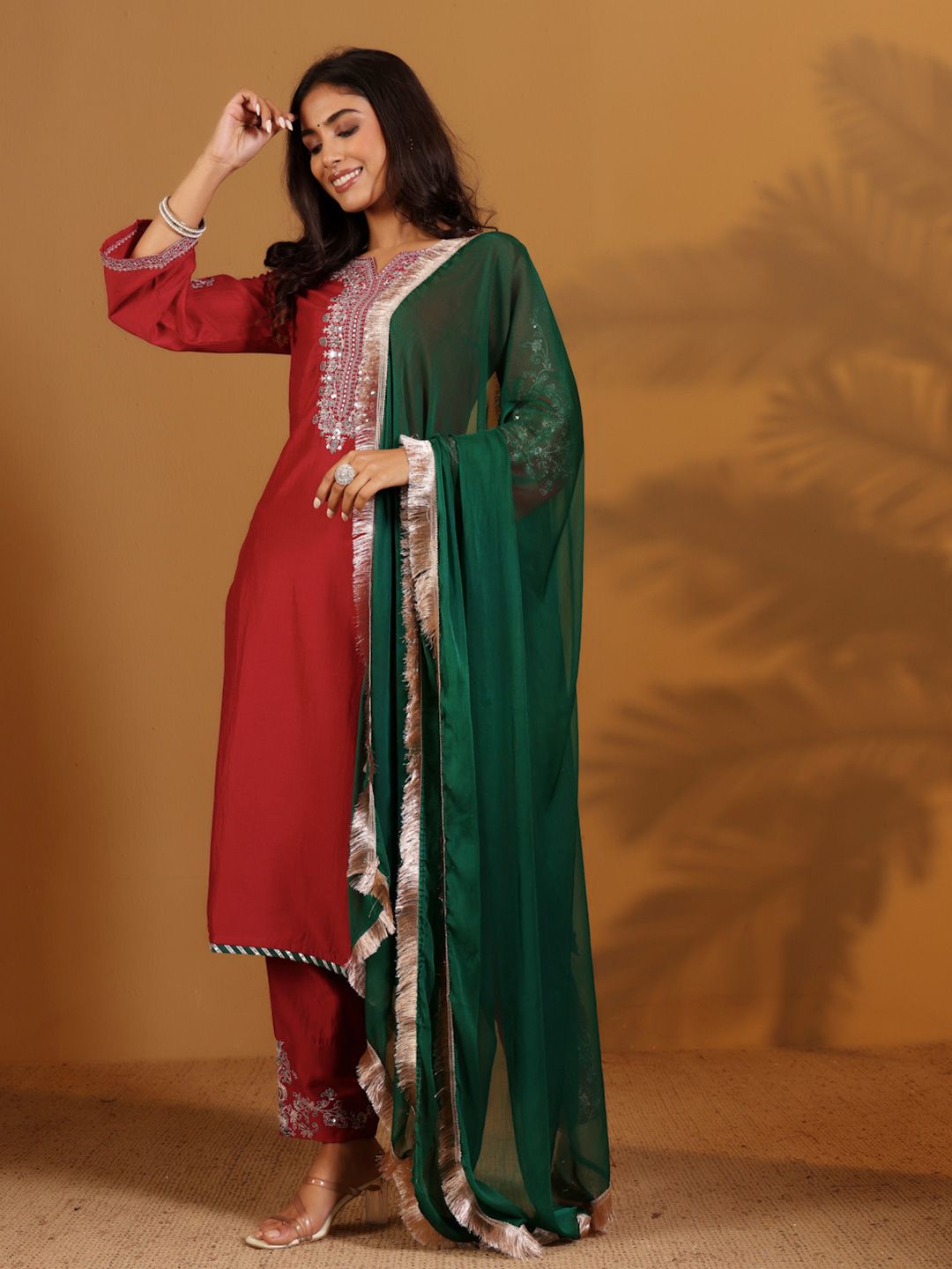 Maroon and green embroidered kurta with trousers with dupatta