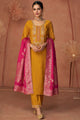 Mustard yellow, pink and gold toned embroidered kurta with trousers and dupatta