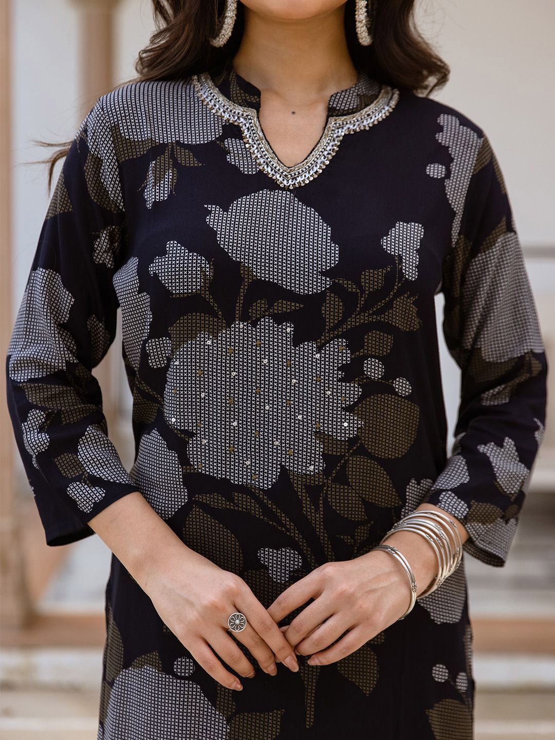 Dhiyona IS Women's Floral Printed Mandarin Collar Sequinned Straight Kurta With Palazzos