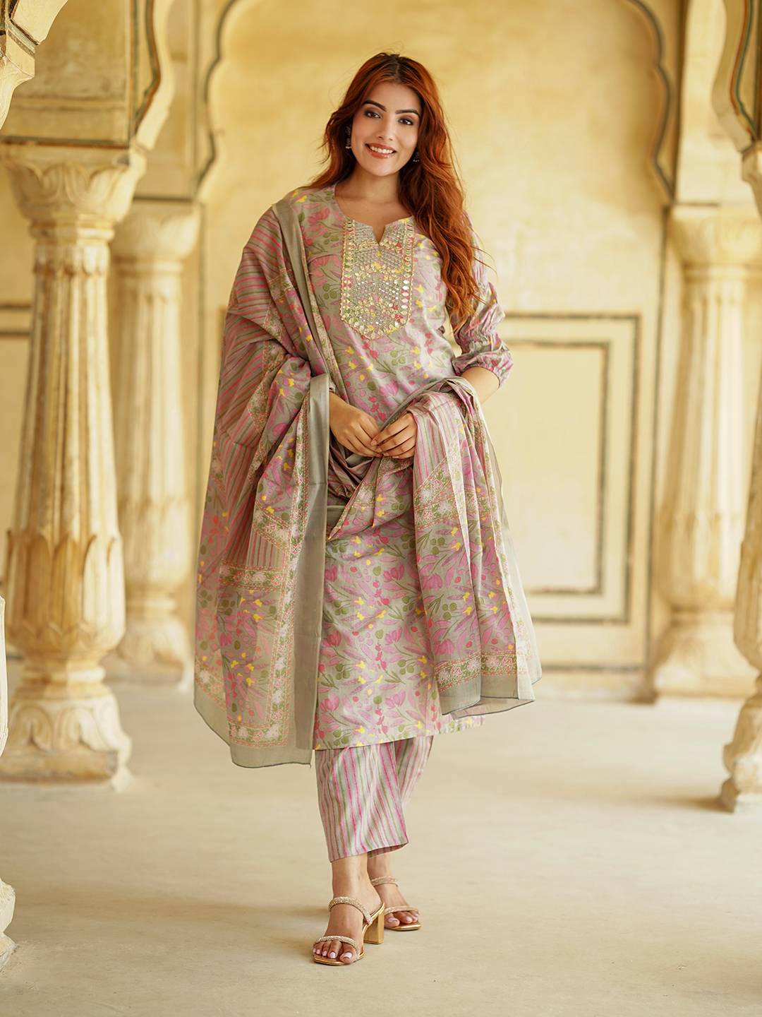 Mauve, grey & green embroidered Kurta with Trousers with dupatta