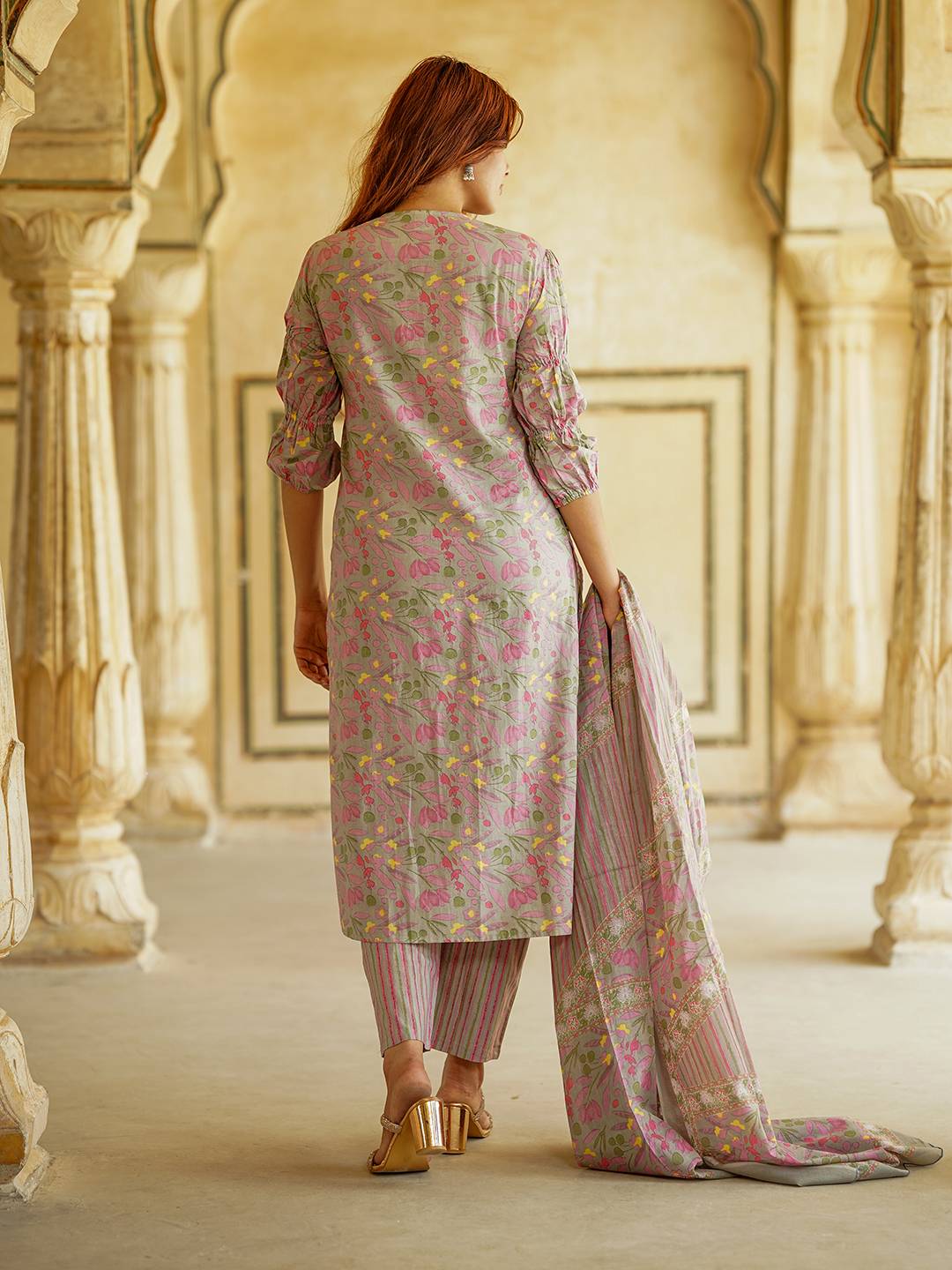 Floral Printed Mirror Work Pure Cotton Straight Kurta With Trousers & Dupatta
