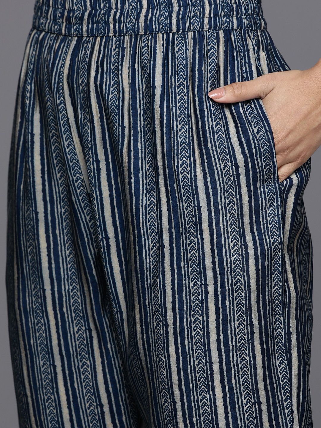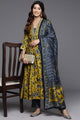 Mustard yellow, navy blue & grey printed Kurta with Trousers with dupatta