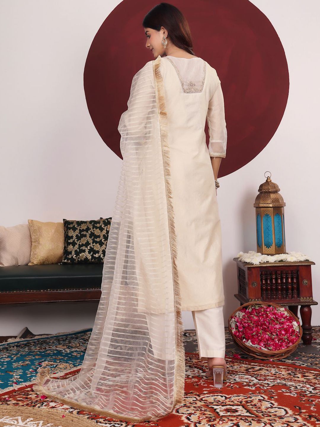 Off white & gold-toned yoke design Kurta with Trousers with dupatta