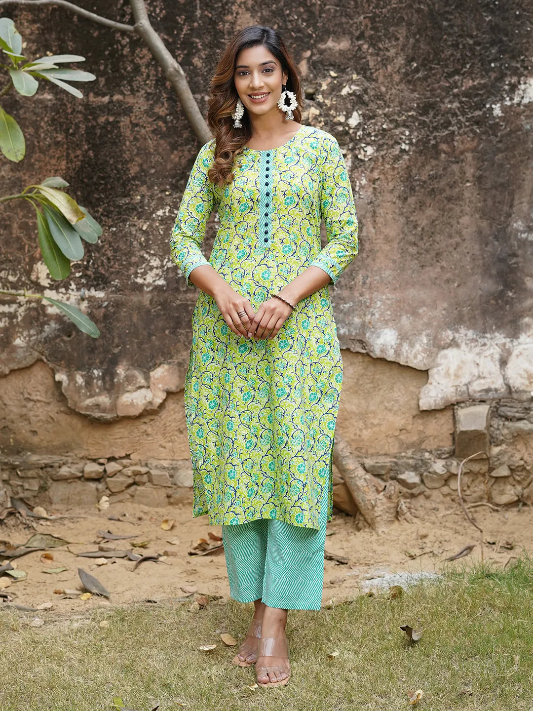 Green Floral Printed Regular Pure Cotton Kurta with Trousers