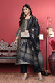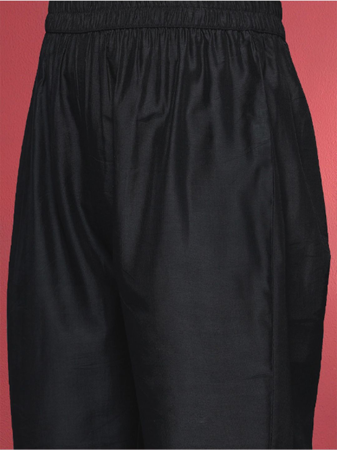 1 Kurta, 1 Trouser, 1 Dupatta Kurta: Fit-Straight Fit Color -Black & Grey Print & Pattern-Batik Printed, Sequin Embroidery Neckline -Round Neck Sleeves -Three-Quarter Lining-Cotton Blend Trouser Length - Calf Length Pattern- Solid Fit -Regular fit Waist- Elastic Dupatta: Pattern-Tropical Printed