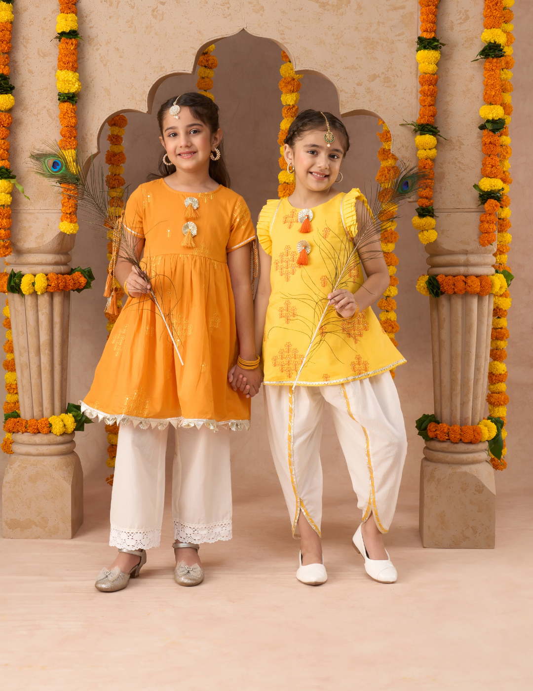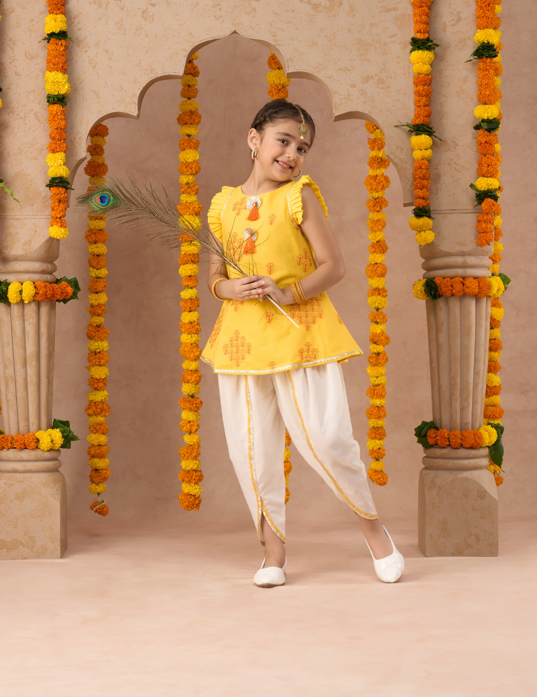 Marigold magic Girls Yellow Cotton Kurta and White Dhoti Ethnic Set
