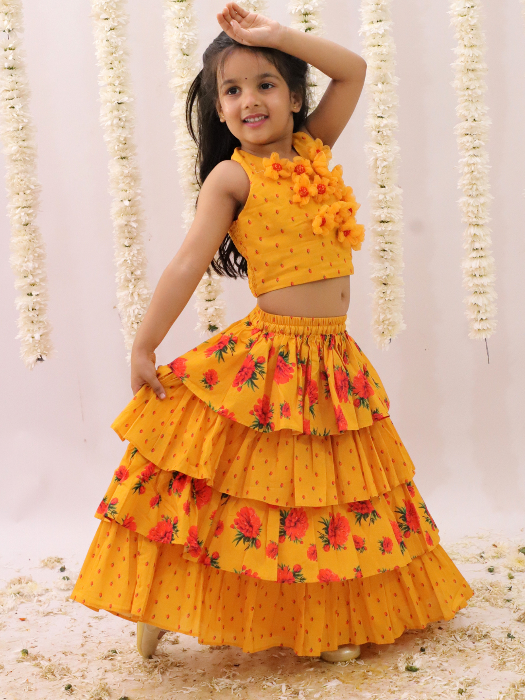 Genda Phool Mustard Choli and Lehanga Set for Girls