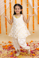 Bring elegance and festive charm to your little girl’s wardrobe with the Lil Drama Chanderi Sleeveless Foil Bird Print Kurta and Dhoti Set in a classic off-white shade. Perfect for weddings, family gatherings, and special occasions, this set combines style and comfort beautifully.