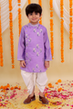 Dress your little boy in festive sophistication with the Lil Drama Chanderi Full Sleeve Foil Flower Print Kurta Dhoti Set in a royal purple shade. Ideal for weddings, traditional functions, and festive celebrations, this set beautifully blends classic ethnic style with comfort for all-day wear.