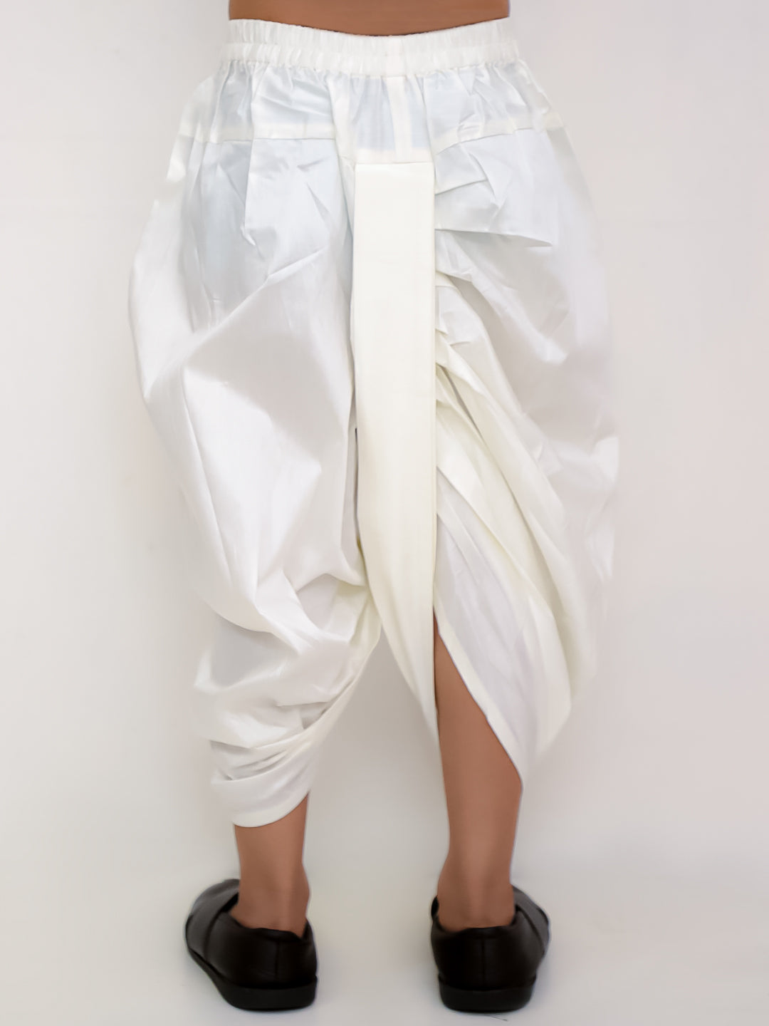Traditional Dhoti: Mid-rise elasticated poly silk dhoti for ease of movement and comfort.