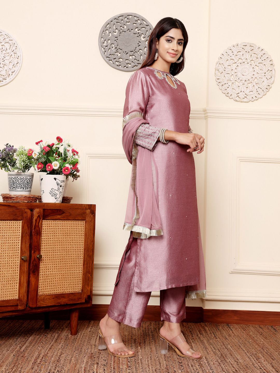 Dhiyona VA Women'sLavender Sequinned Straight Kurta with Trousers & Dupatta