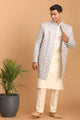 Description: Trend setting Men's Indowestern Style Mirror Work Sherwani made of imported high quality fancy fabric with invisible button placket.This Set Contains Kurta And Pant Style Pyjama.