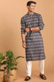 Description: Ikkat Printed Flat Collar Kurta And Pant Style Pyjama For Men.