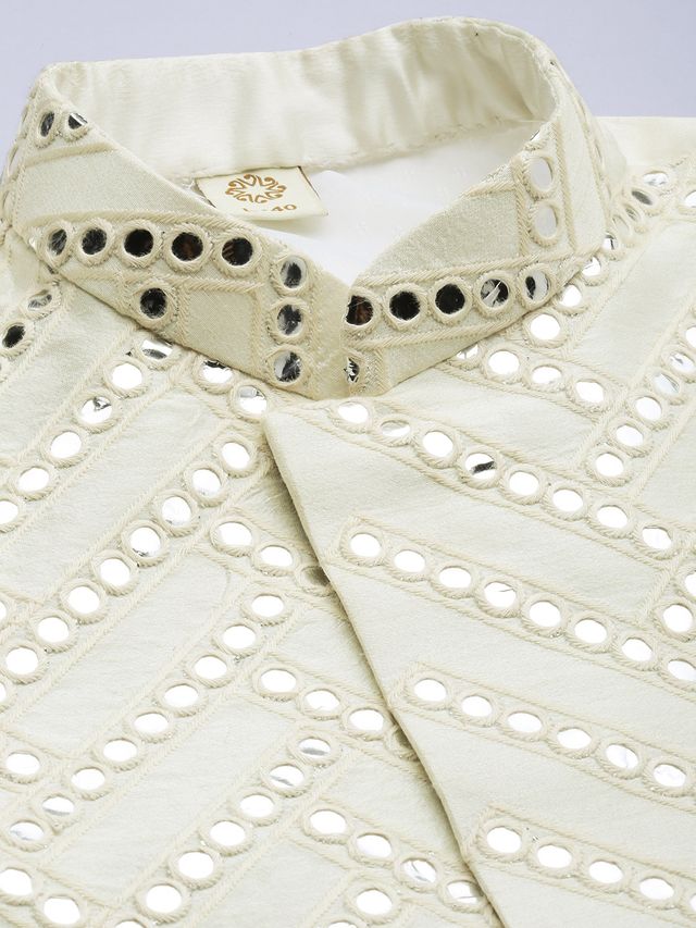 Description: Trend setting Men's Indowestern Style Mirror Work Sherwani made of imported high quality fancy fabric with invisible button placket.Comes with Cowl Style Patiala Dhoti Pant Set.