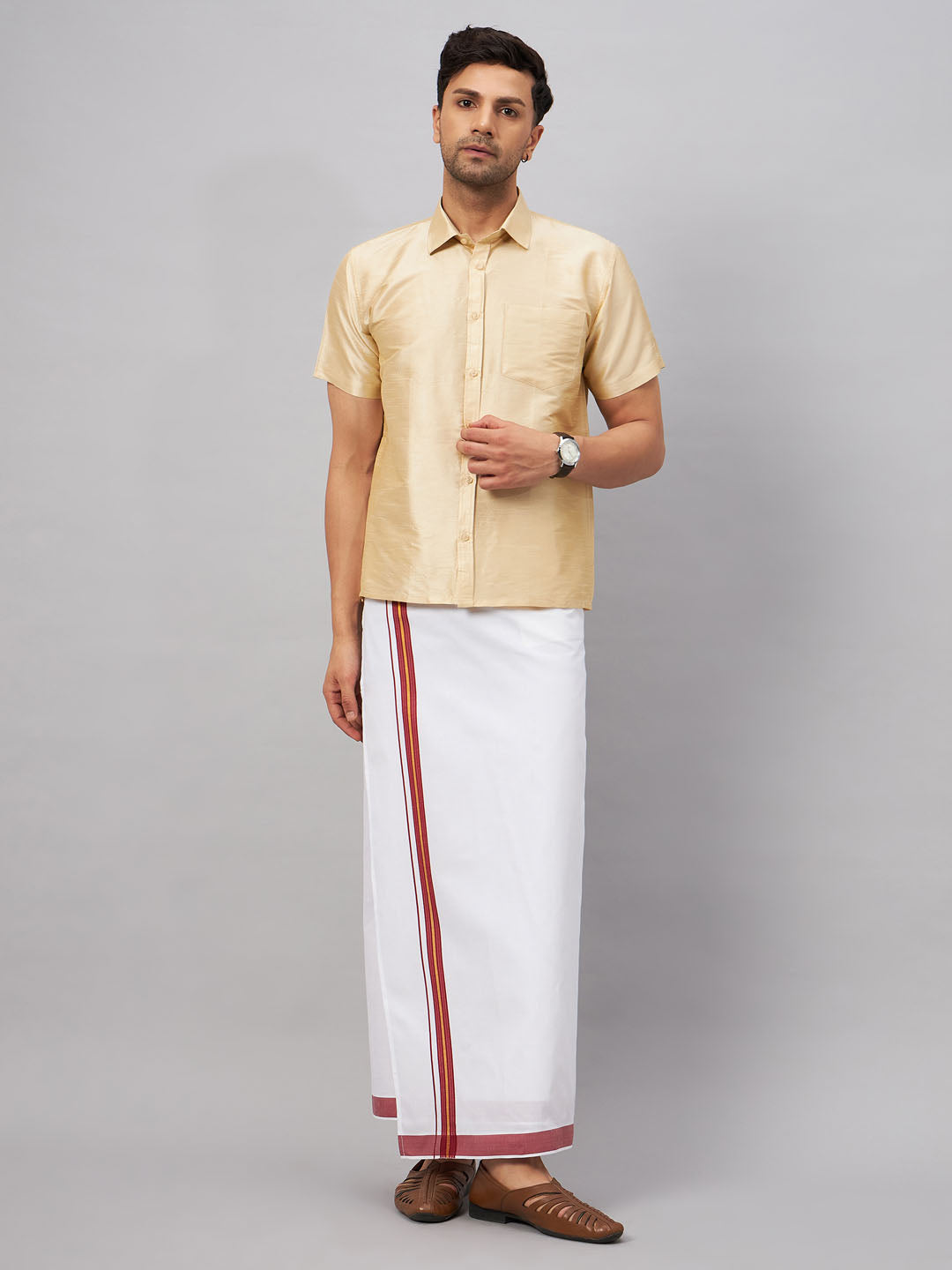 Description: South Indian Style Half Sleeves Silk Shirt And Mundu Set