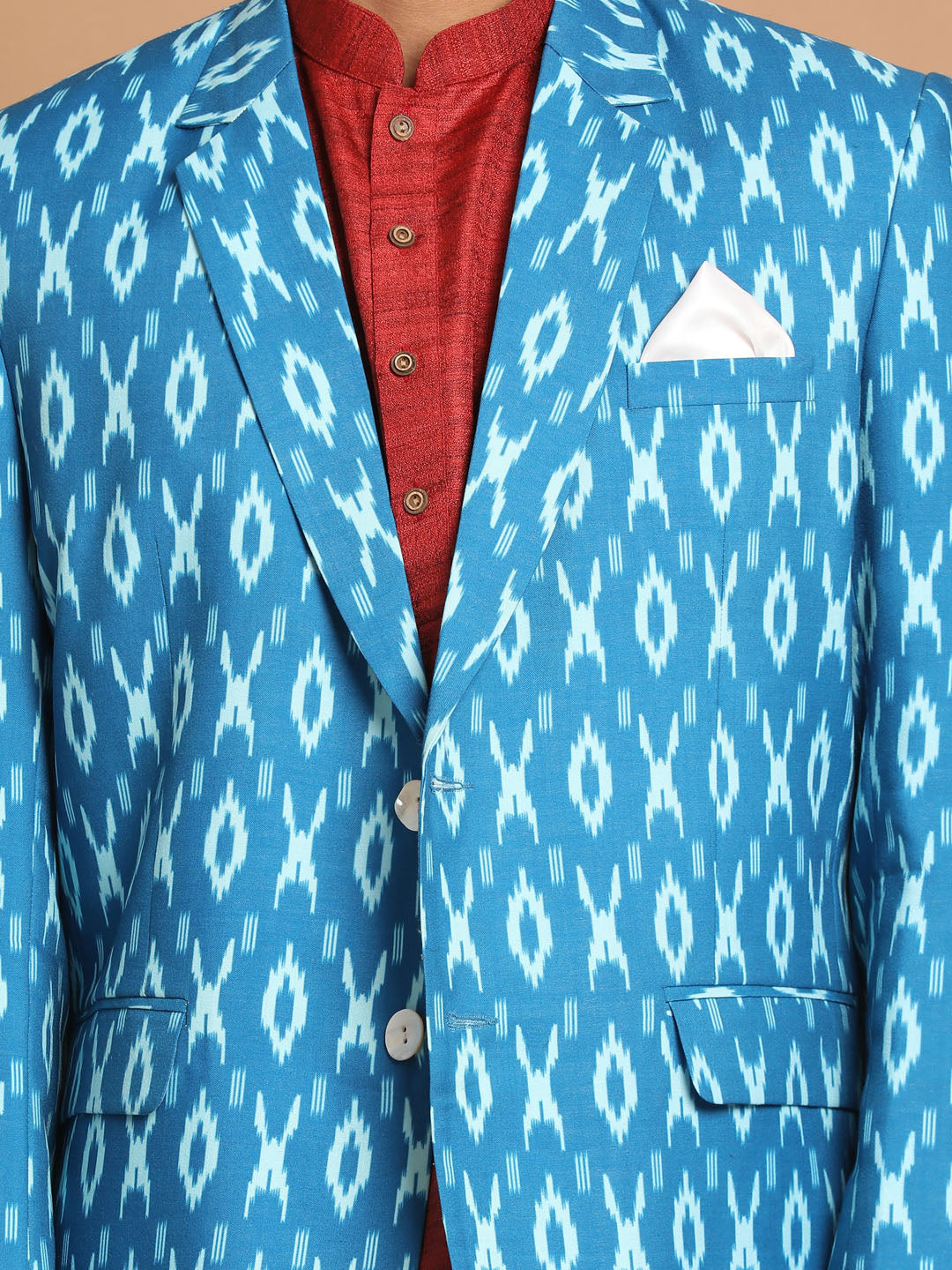 Description: Traditional Ikkat printed Cotton Blend Blazer. The Set Contains a Classic Matka Silk Kurta and Pant Style Pyjama that Compliments the Color Of the blazer.