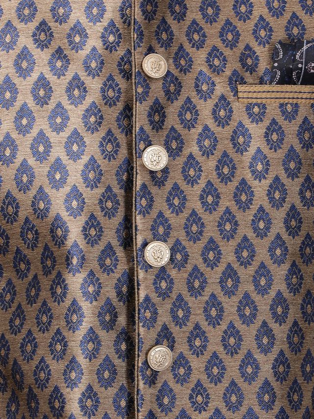 Description: Banarasi Brocade Jamawar Rich Modi/Nehru Jacket with Embroidered Collar and Pocket detailing along with a Pathani Style Mid Length Curved Kurta having matching collar patti and cuffs with Cuffed Sleeves and a Cowl Pattern Patiala Style Dhoti Pant set.