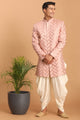 Description: Trend setting Men's Indowestern Style Mirror Work Sherwani made of imported high quality fancy fabric with invisible button placket.Comes with Cowl Style Patiala Dhoti Pant Set.