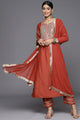 Rust & gold toned mirror work yoke design Kurta with silk blend Trousers with silk chiffon fringed dupatta