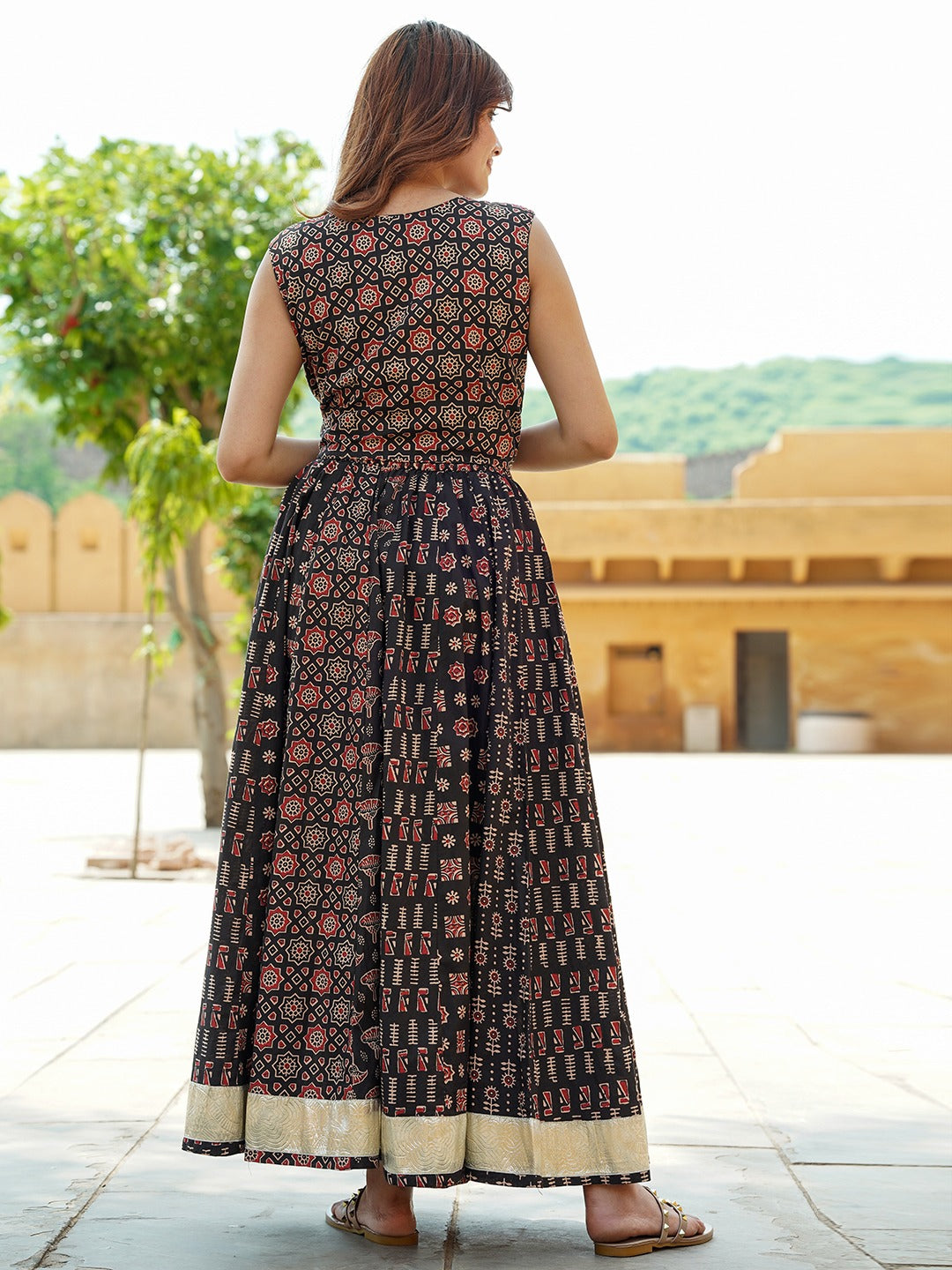 Black and red printed ready to wear blouse, has a round neck, sleeveless, slip-on closure