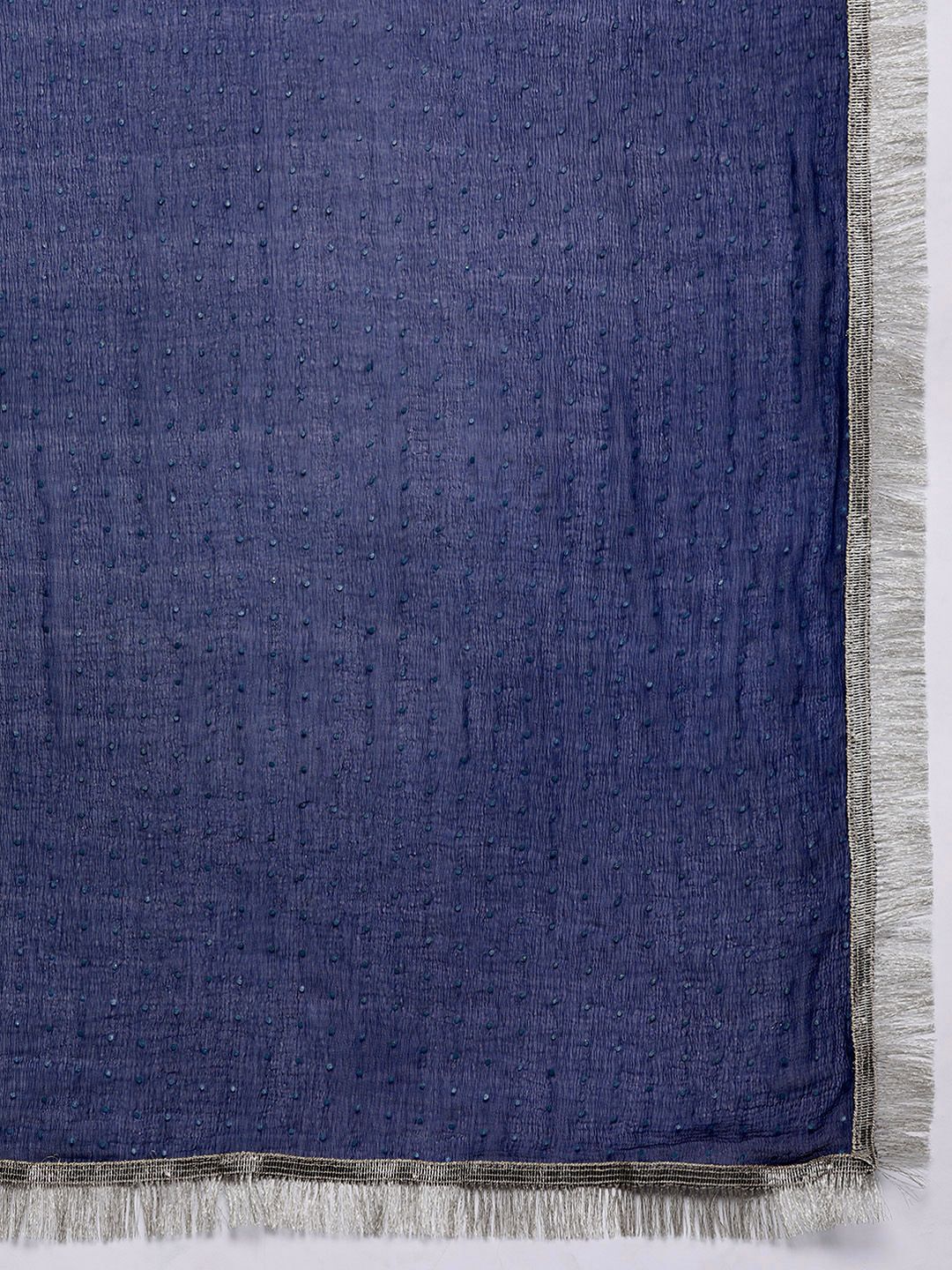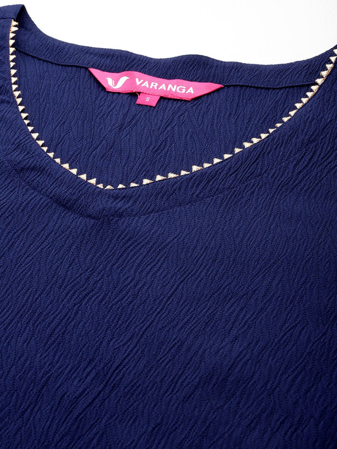 1 Kurta, 1 Trouser, 1 Dupatta Kurta: Fit-Straight Fit Color -Navy Blue Print & Pattern-Crinkled Textured with Gota Work Neckline - V Neck Sleeves - Bell Sleeves Trouser Length - Calf Length Pattern- Solid Fit -Regular fit Waist- Elastic Dupatta Pattern-Mukaish work with Fringe lace