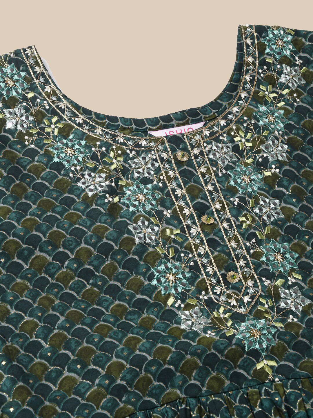 Dhiyona IS Women's Printed Green Empire Gotta Patti Pure Cotton Kurta with Trousers & Dupatta