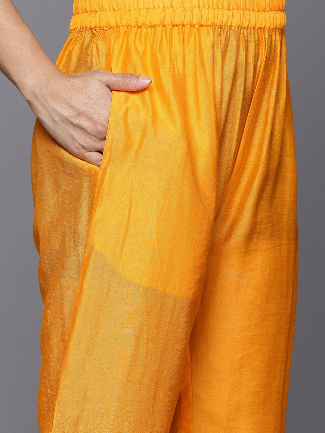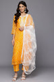 Yellow printed zari and sequinned Kurta with Trousers with net embroiredered dupatta.
