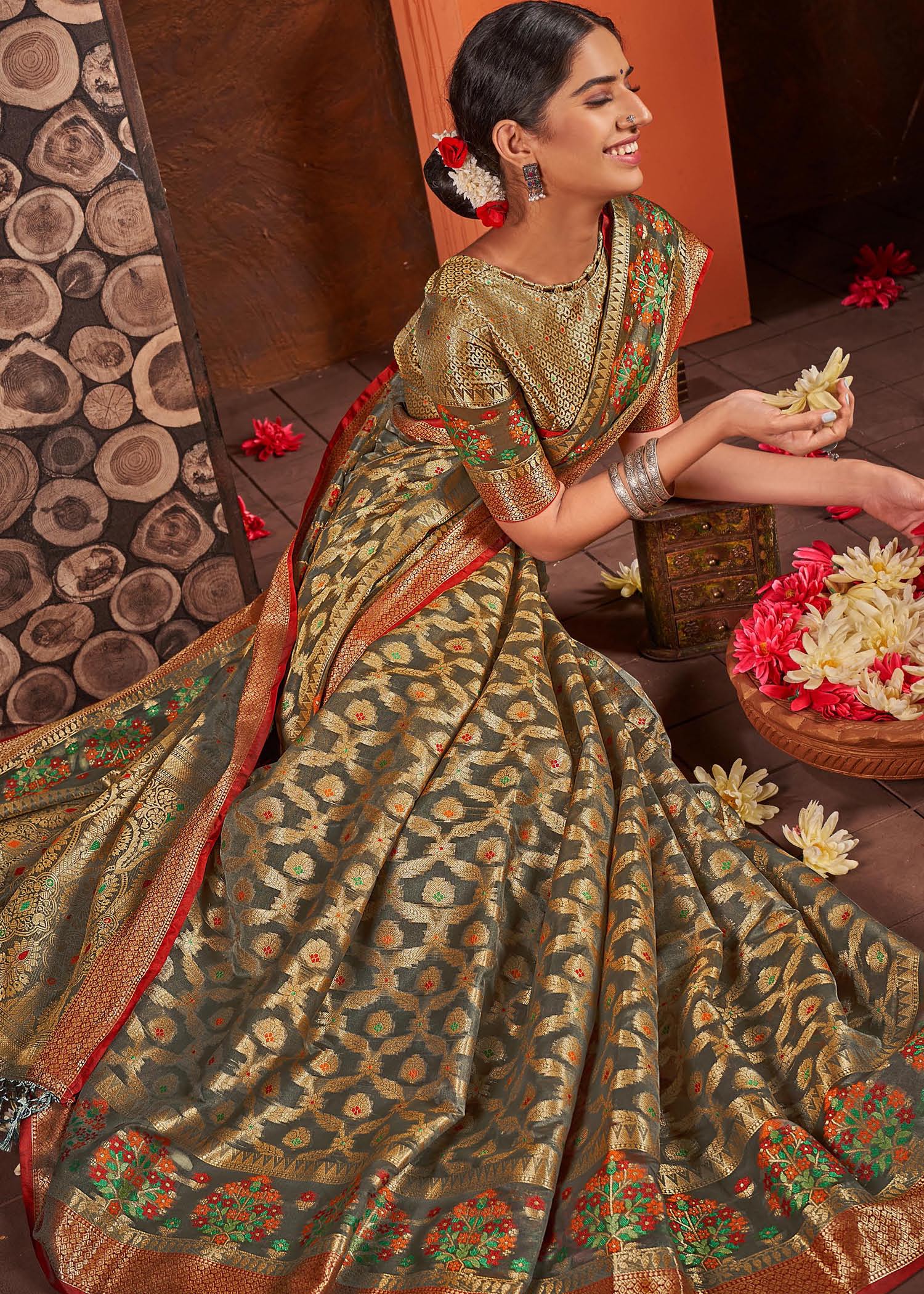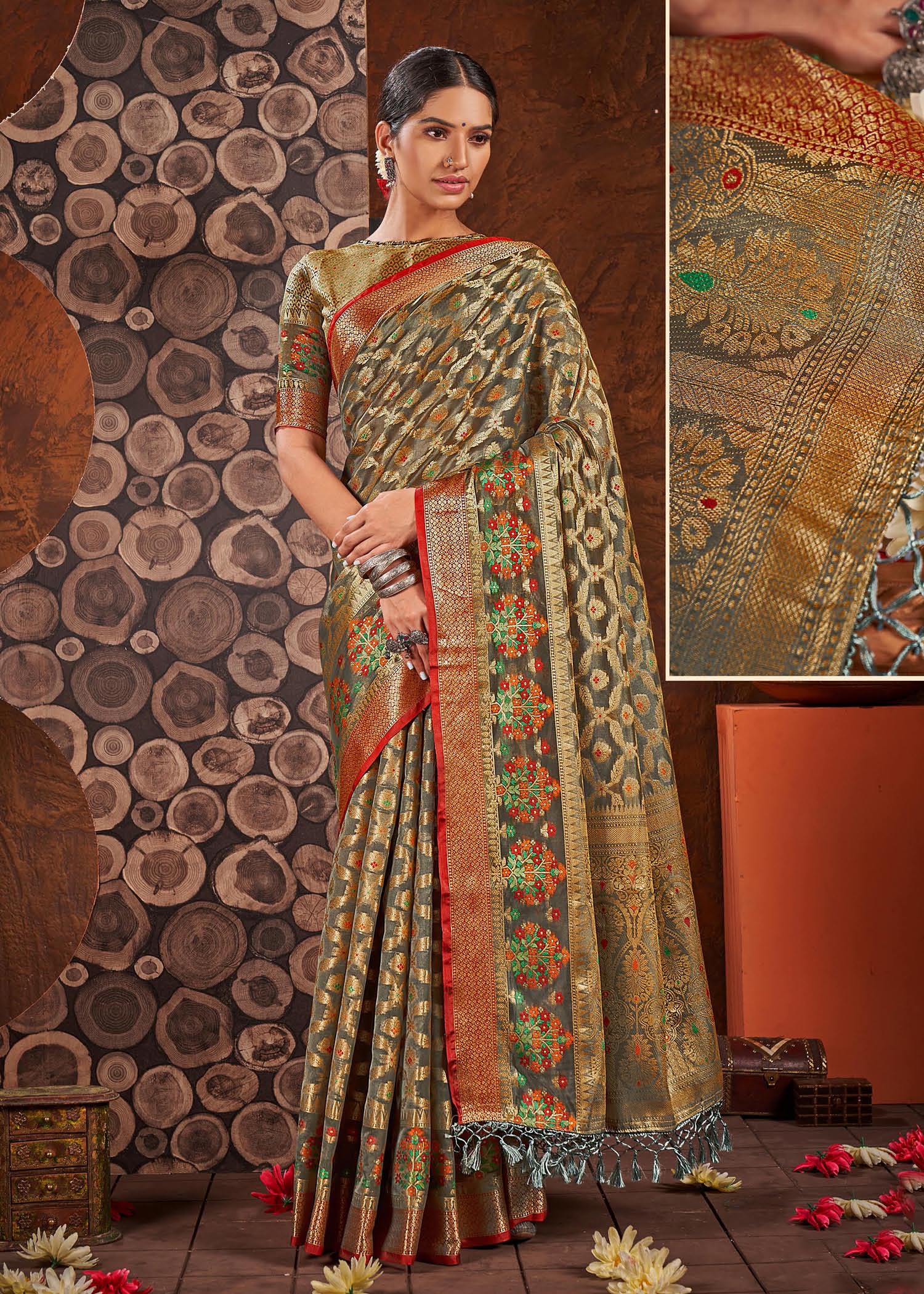 Dhiyona GR Women's Rashmika Dovetail Grey Zari Woven Design Banarasi Organza Saree