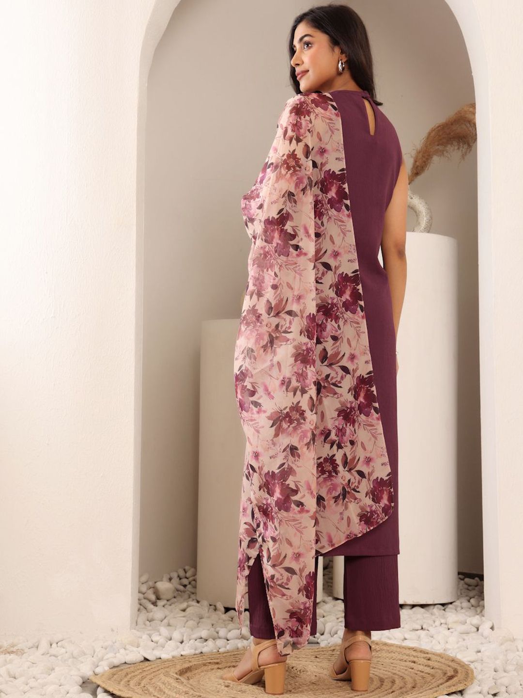 Purple, beige and brown solid kurta with trouser with dupatta