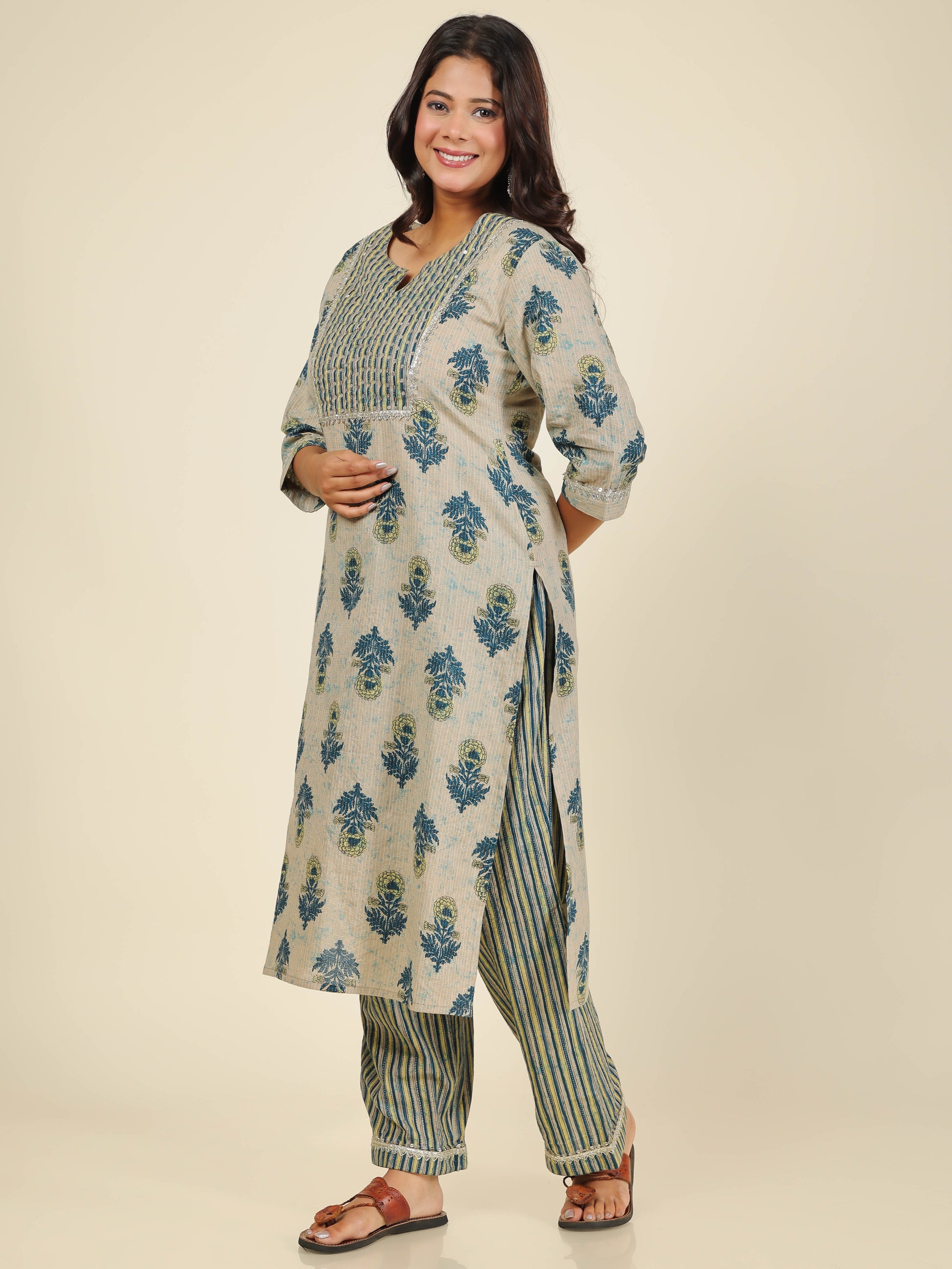Styling Suggestion: Pair the kurta with simple stud earrings and a sleek watch for a polished office look. Opt for block heels or juttis for comfort. Keep makeup natural with soft blush and nude lipstick, and style your hair in a ponytail or loose waves for a refined yet effortless vibe.