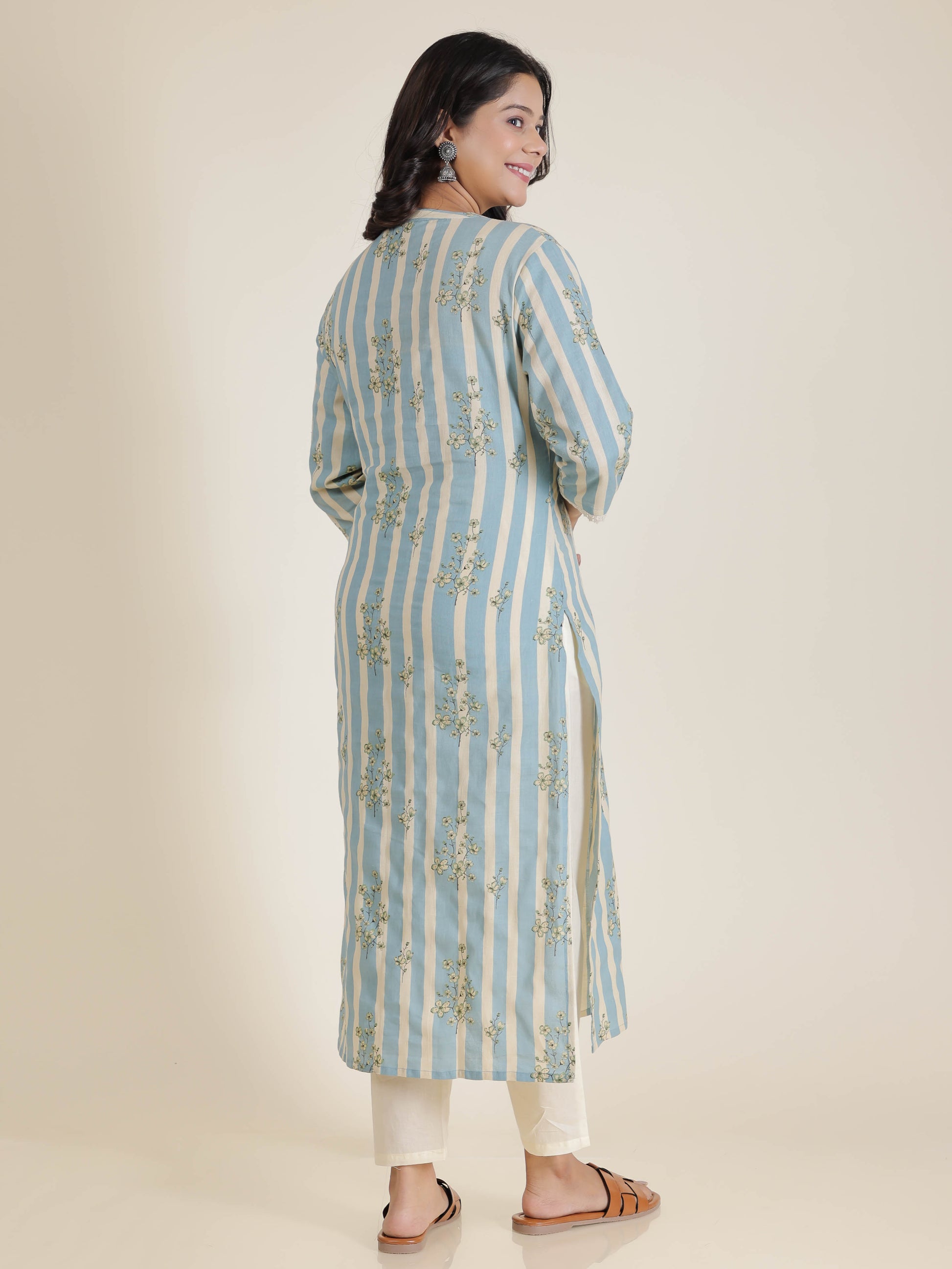 Styling Suggestion: Pair the kurta with simple stud earrings and a sleek watch for a polished office look. Opt for block heels or juttis for comfort. Keep makeup natural with soft blush and nude lipstick, and style your hair in a ponytail or loose waves for a refined yet effortless vibe.