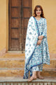 White Blue Floral Printed Angrakha style Pure Cotton Kurta With Trousers & Dupatta