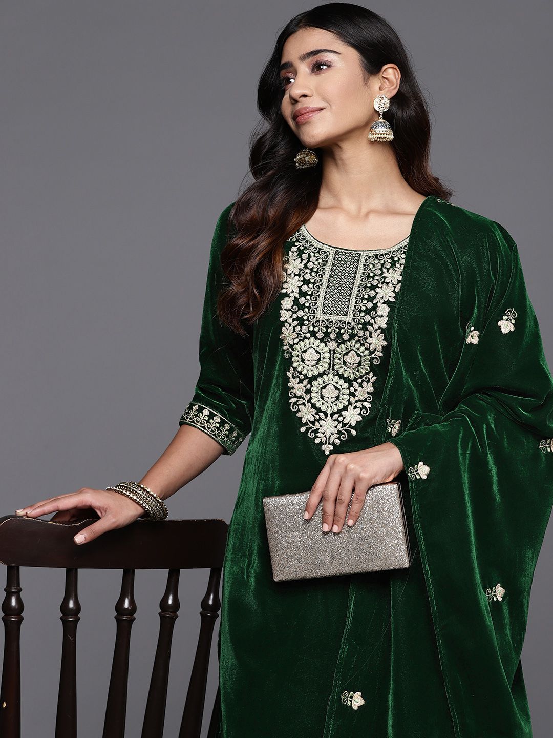 Dhiyona VA Women'sWinter floral Zari Embroidered Velvet Kurta Set with Dupatta.