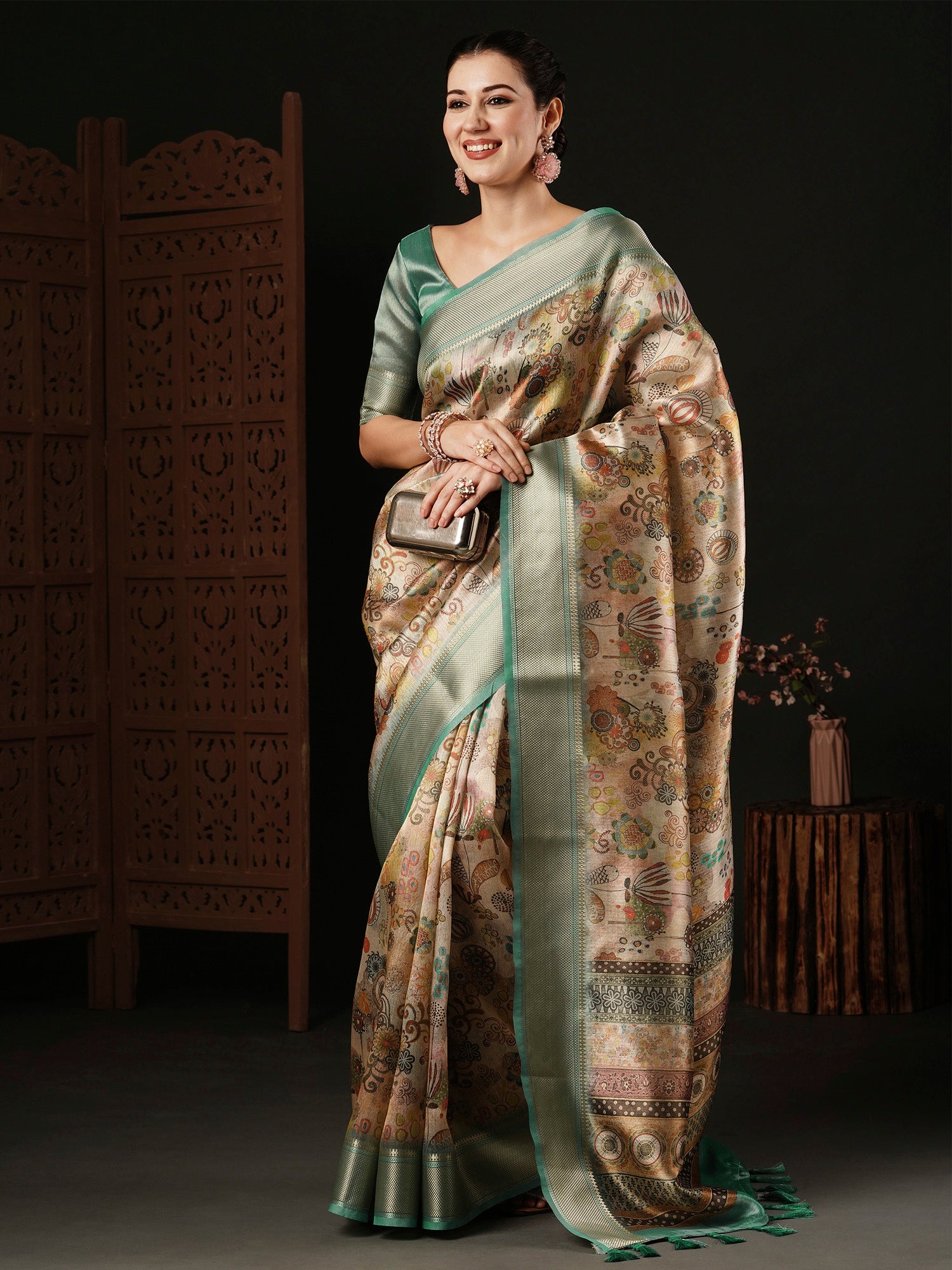 Women's Banarasi Silk Beige Printed Designer Saree With Blouse Piece
