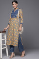 Dhiyona VA Women's Beige & Blue Printed Pure Cotton Kurta with Trousers