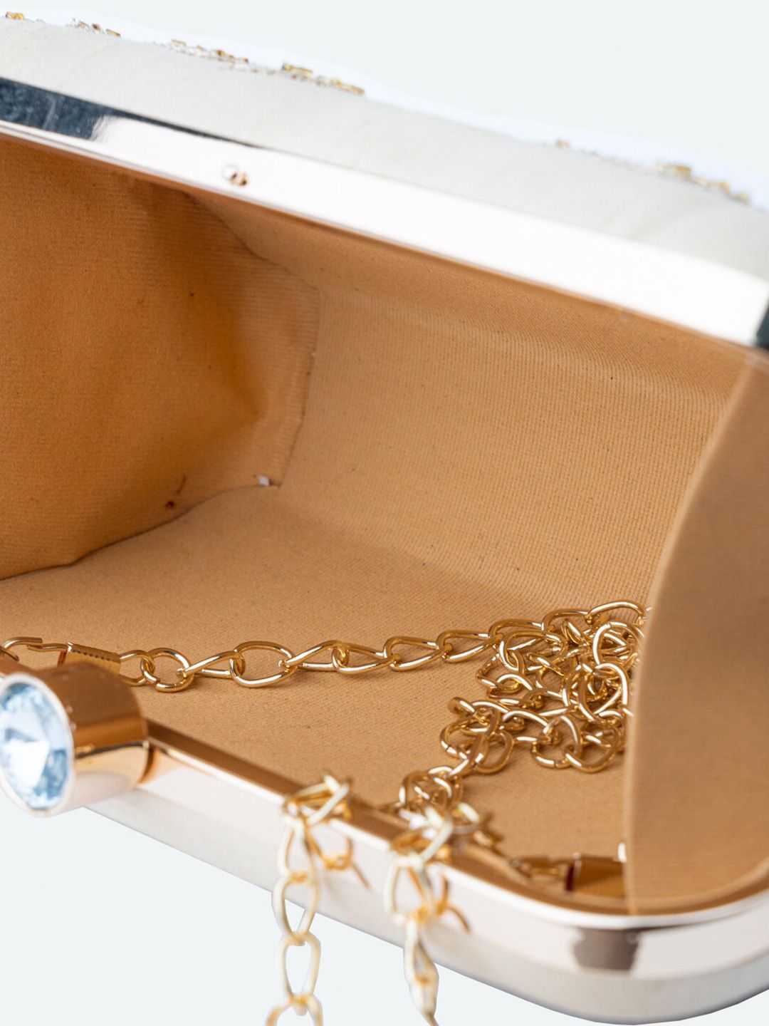 Grace your festive look with this beige box clutch, adorned with intricate pink and gold-toned floral hand embroidery and shimmering embellishments. The structured silhouette features a secure click closure and a detachable shoulder chain for hands-free elegance. Whether styled with a pastel saree or a silk kurta set, this clutch adds a refined touch of artistry and sparkle to your celebration ensemble.