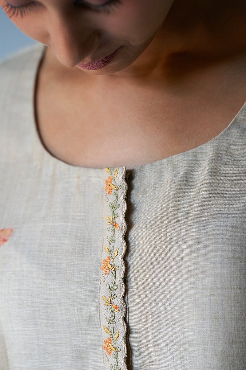 Women's Beige Woven Viscose Chanderi Kurta Suit Set With Delicate Hand Work Detailing and Embroidery Placket