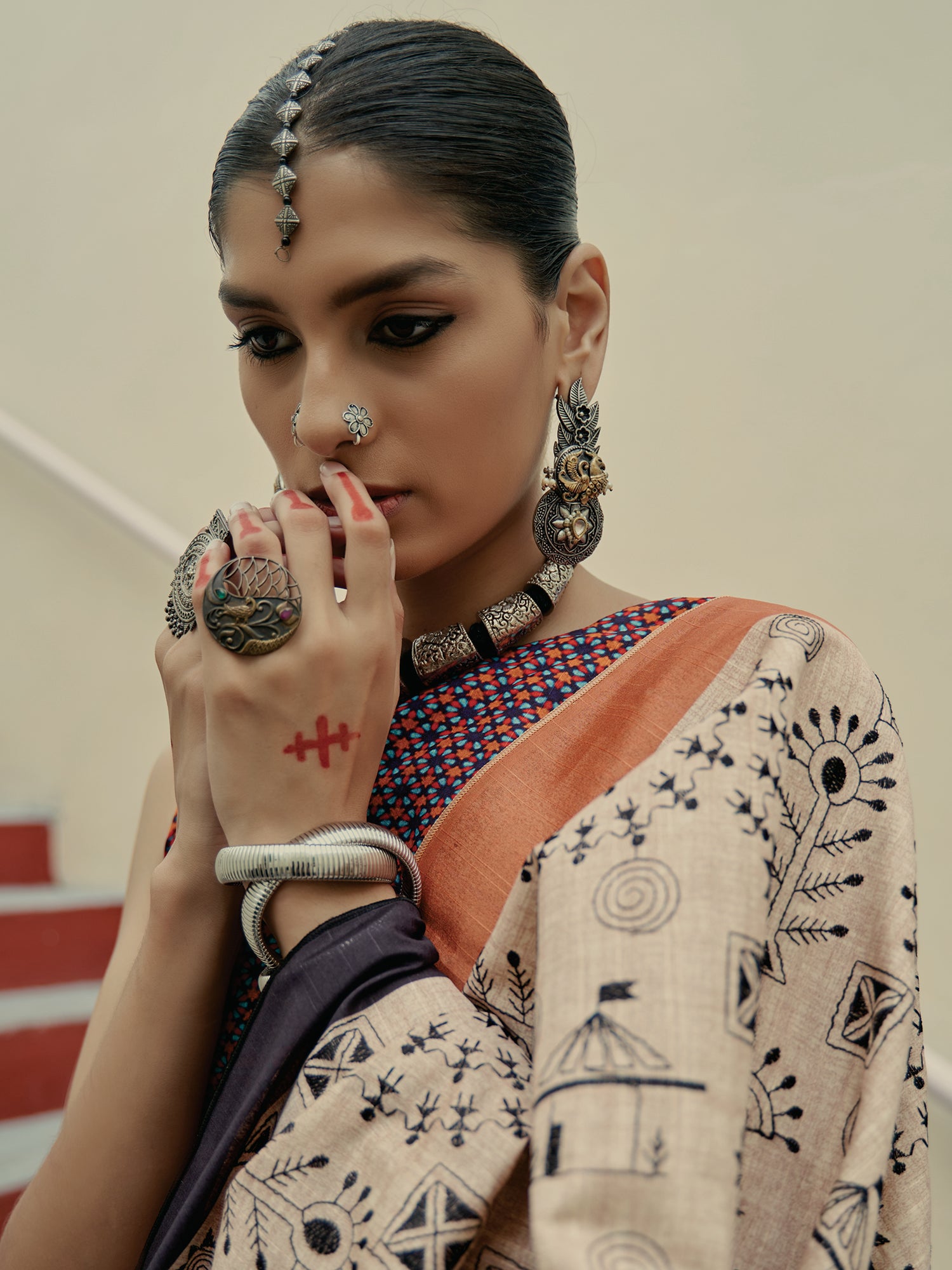 This saree from Dhiyona Fashion is made from Bhagalpuri Silk and is Cream in color. Dhiyona Fashion Ethnic Sarees comes With Blouse Piece, Which can be Stitched according to Your Taste and Preference. This Saree is Crafted by Skill Craftsmen without Compromising on its Quality. With This Beautiful Design and Fabric, This Saree will fetch You Oodles of Compliments and Praise. saree fit size is 5.5 mtr saree & 0.8 mtr blouse, Free Size |.