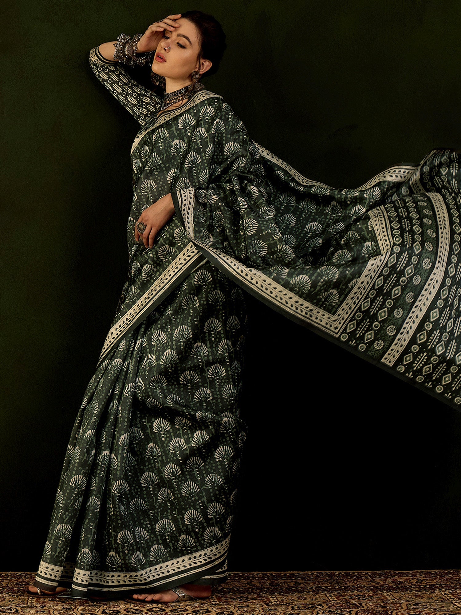 Women's Bhagalpuri Silk Dark Green Printed Designer Saree With Blouse Piece