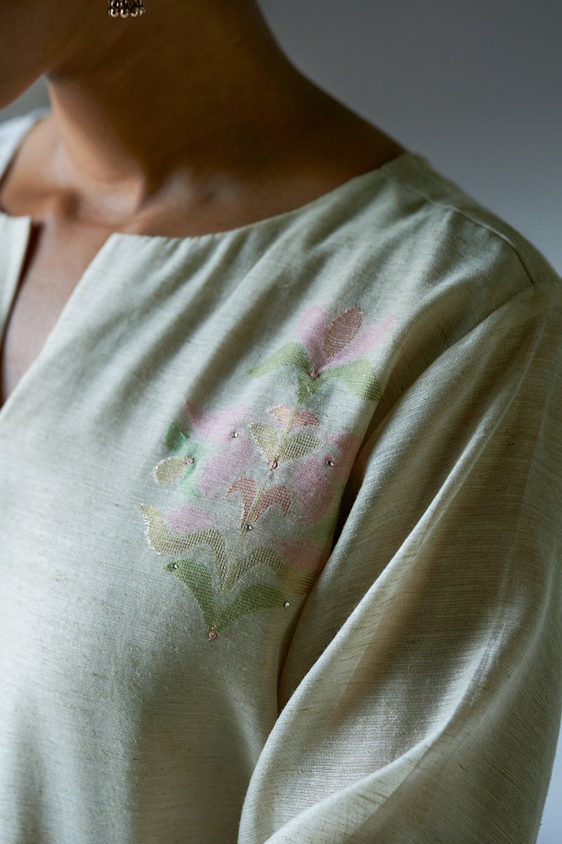 Women's Birch Cream Cotton Linen Woven Kurta Suit Set With Hand Work Detailing