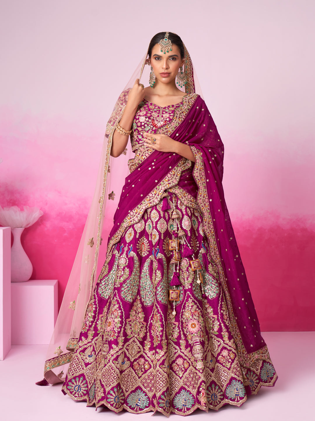Women Burgundy Pure silk Moti, Sequins embroidery Bridel Lehenga choli & Dupatta