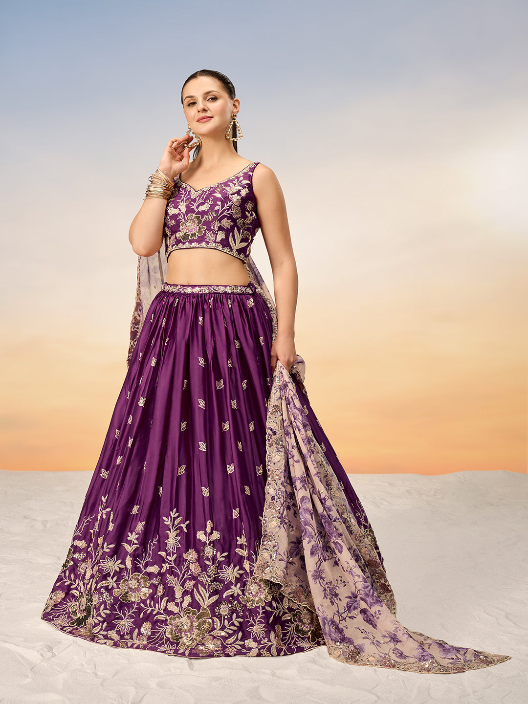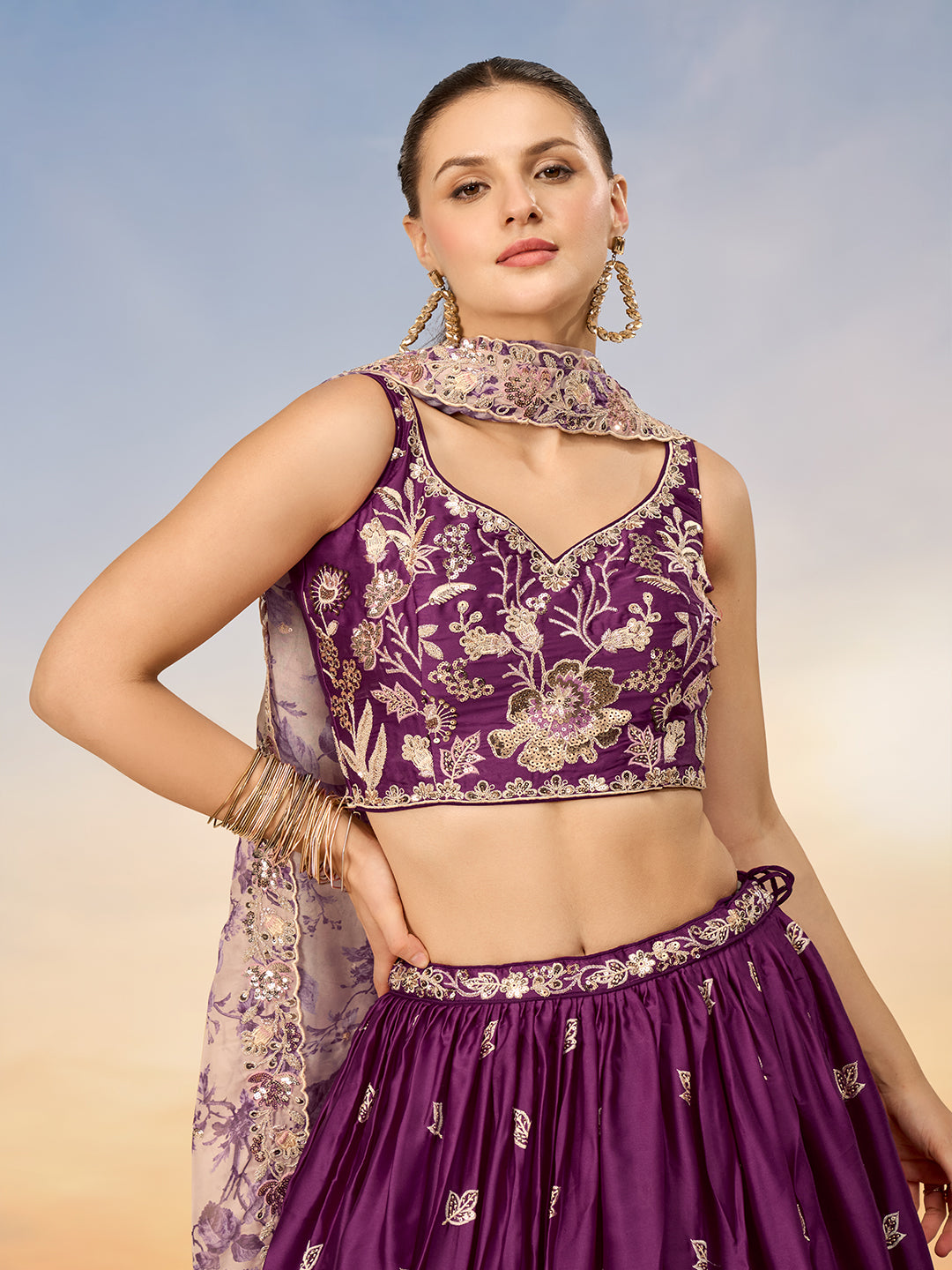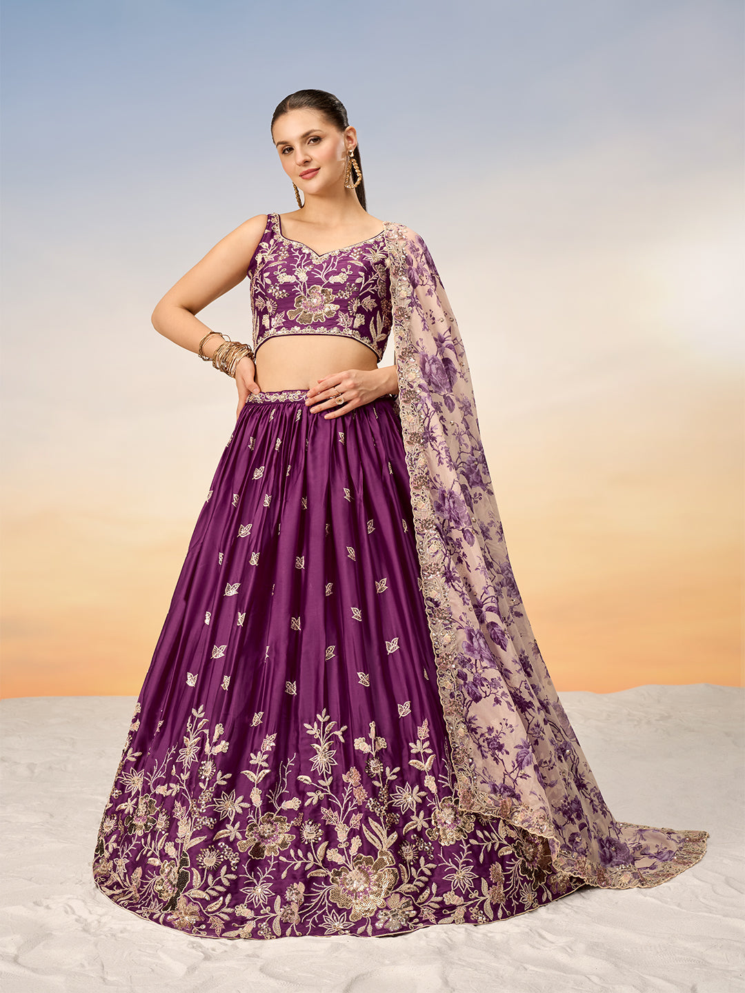 Burgundy Satin silk Sequins embroidery Semi-Stitched Lehenga choli & Dupatta