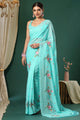 Women's Chiffon Light Blue Embroidered Designer Saree With Blouse Piece