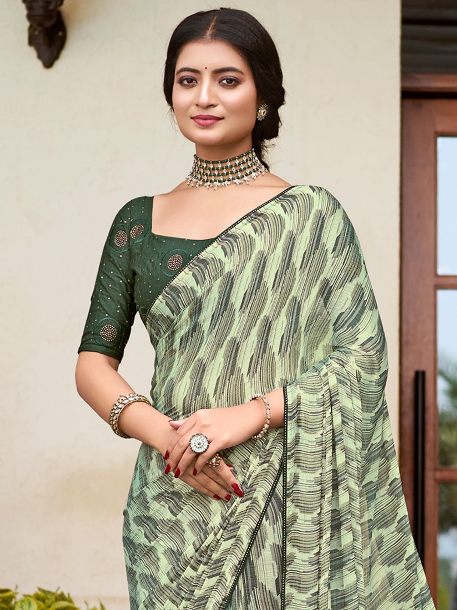 Women's Chiffon Light Green Printed Designer Saree With Blouse Piece