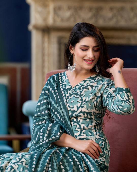 Women Dark Green, White Printed Viscose Rayon Kurta, Pant And Dupatta Set