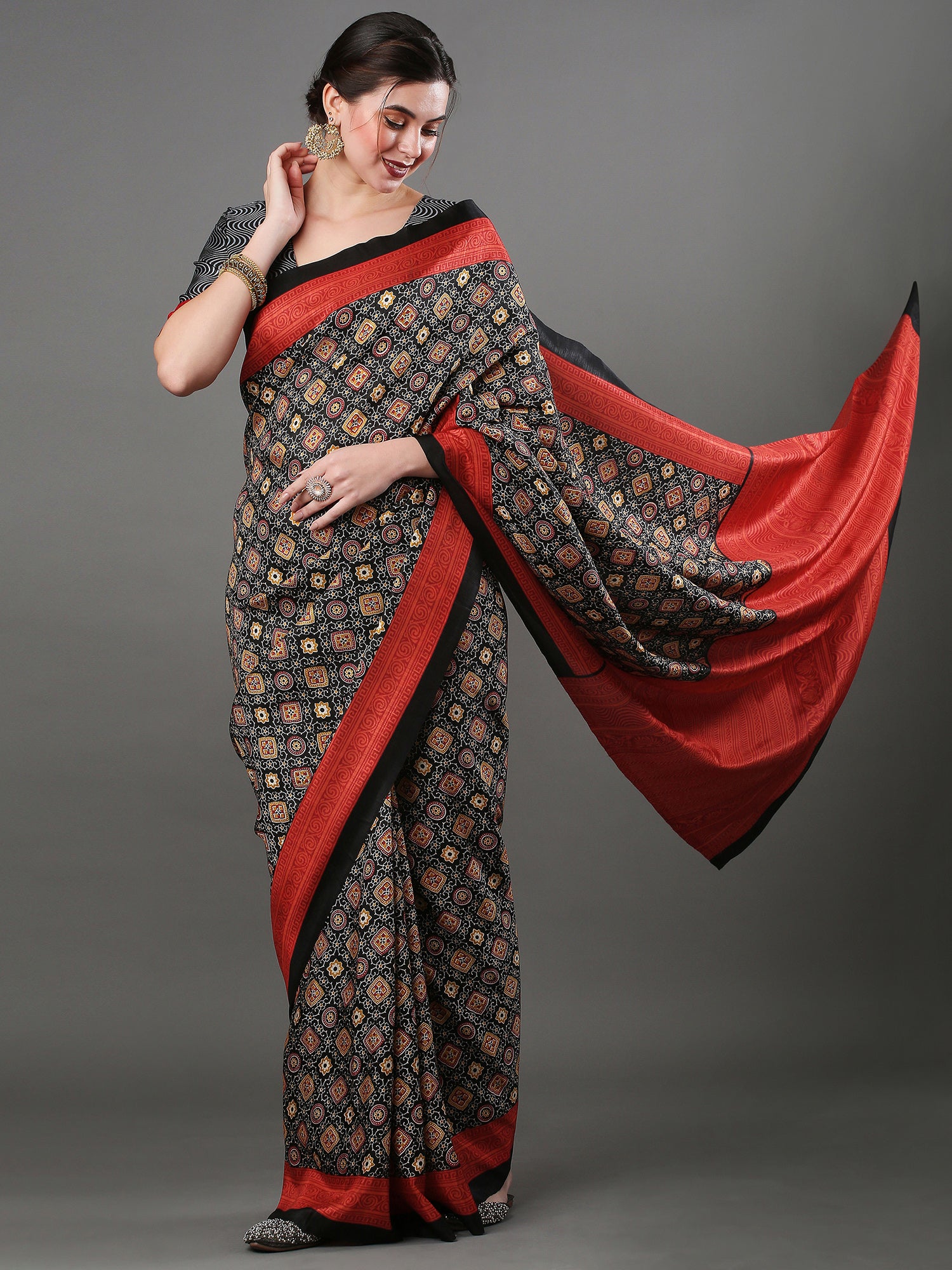 Women's Dola Silk Black Digital Print Designer Saree With Blouse Piece
