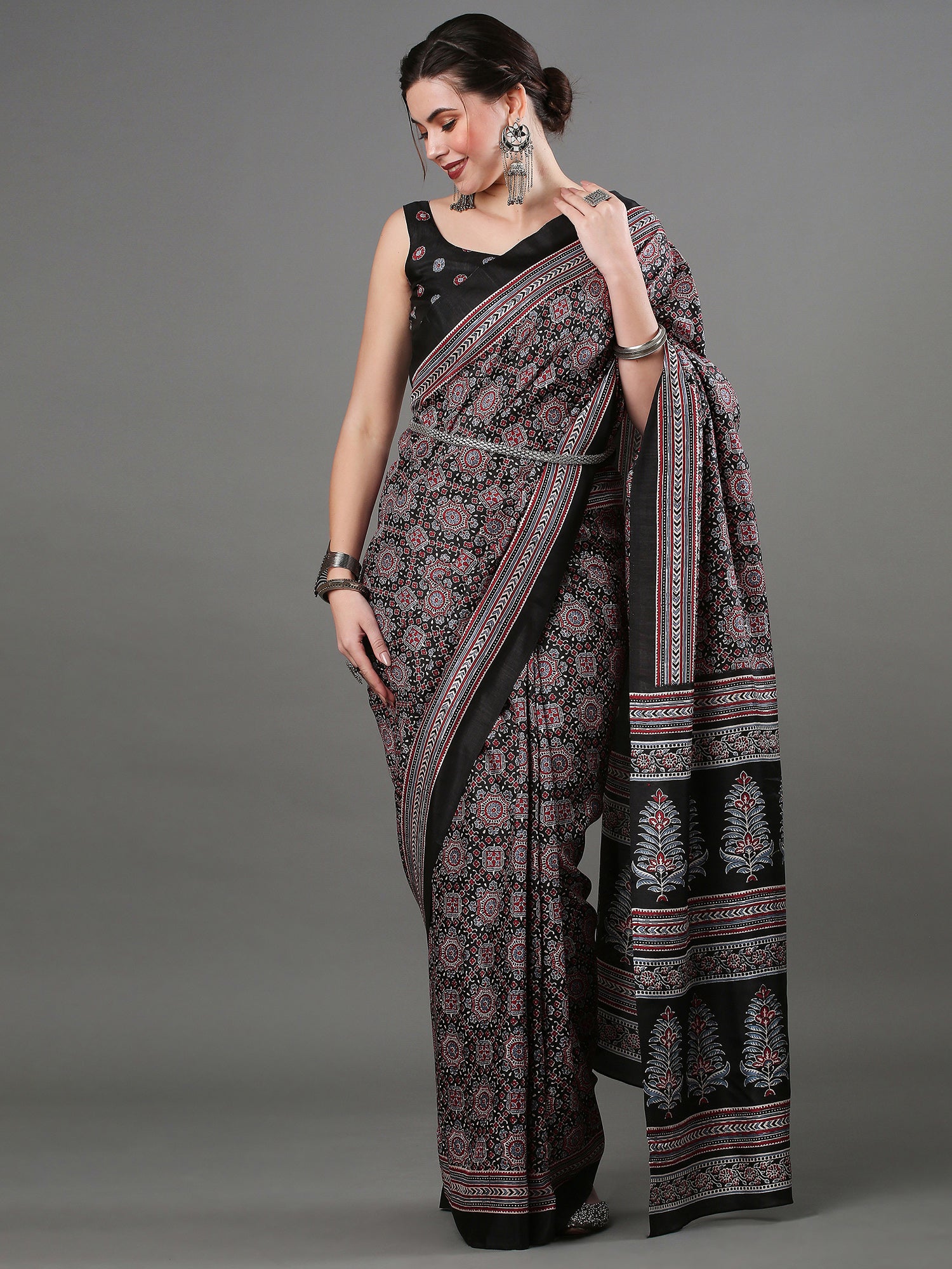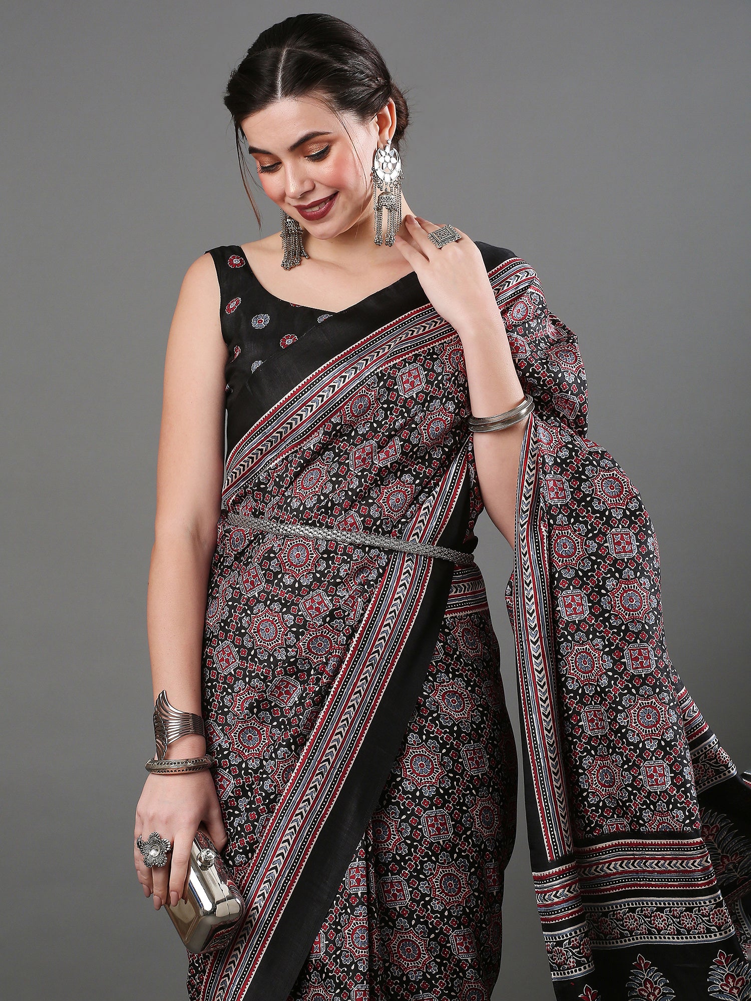 Women's Dola Silk Black Digital Print Designer Saree With Blouse Piece